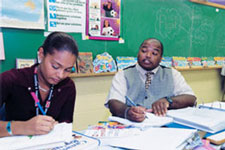 Des enfants en chemise blanche et pantalon noir se trouvent déjà devant la porte d’entrée quand Peter Banhan arrive à l’Amesbury Middle School peu après 8 h. Il se dirige vers la porte. Des centaines de colombes en papier sont collées au mur du vestibule - poèmes et messages sur les attaques terroristes survenus aux États-Unis la semaine d’avant. «Habituellement, les enseignants ont un délai de grâce d’environ deux semaines au début de l’année, dit-il, tout spécialement dans une école intermédiaire. Les enfants arrivent dans une nouvelle école et ils veulent plaire. Mais pas cette année. Et je ne sais pas pourquoi.» Banhan s’arrête brièvement dans le bureau, puis se dirige vers la classe 107 où il enseigne à la 6e année. Il allume les lumières, salue son collègue d’en face et consulte sa partenaire Nicky Arrindell avec qui il coenseigne à 56 élèves. Ils parlent avec calme de la journée qui s’amorce : une leçon sur la ponctuation et un exercice en écriture, une introduction au manuel des sciences sociales, l’éducation physique, un test en mathématiques et un cours de sciences sur le vol. Presque tous les élèves d’Amesbury proviennent de six écoles desservant des immeubles à appartements et des logements à loyer modique. Ces familles sont issues de la diaspora africaine, des Caraïbes, de l’est asiatique ou d’Amérique du Sud. Ici, la plupart des 527 enfants ne parlent pas anglais à la maison, même s’ils sont nés au Canada. L’école a été construite au début des années 50 et en a tous les airs. Les classes 6A et 6B partagent une pièce double qui a connu des jours meilleurs. Une fenêtre brisée est retenue avec du contreplaqué; les autres sont couvertes de stores vénitiens vétustes. La pièce du côté de Banhan compte des tables rondes et des chaises pourpres. Un téléviseur et deux vieux rétroprojecteurs sur pied reposent contre les fenêtres. Deux ordinateurs se trouvent près de la porte double. La cloche sonne. Les élèves se rendent bruyamment à leur casier puis en classe. Debout à la porte de la classe, Banhan fait la rencontre inattendue d’un parent dont le fils a pris du retard récemment. La mère croit qu’il a fait ses devoirs. Le garçon se joint à la conversation et Banhan est très clair quant à ses attentes. Les deux classes s’assemblent et Banhan enseigne la leçon sur l’usage correct de la virgule et des deux-points. Arrindell pose une question : «Quel numéro porte Michael Jordan?» Les mains se soulèvent et elle passe du chandail de la vedette de basket-ball à ses coordonnées et à ses qualités propres. Le devoir consiste à écrire des phrases intéressantes et bien ponctuées sur eux-mêmes sur des t-shirts en papier de construction. L’idée plaît. Le bruit en témoigne. Une fille au fond de la classe semble perdue. Banhan s’approche de son bureau, écoute attentivement et mentionne une vedette internationale de cricket. Cette proposition la séduit davantage, mais elle n’est pas complètement convaincue. À 10 h 30, rien n’est fini, mais les élèves sont interrompus par le Ô Canada et les annonces. Après, Banhan passe un savon à quatre garçons dont le comportement, à son avis, était «tout à fait dégoûtant». Une fille qui avait saigné du nez plus tôt ce matin revient prendre ses affaires; sa mère lui a donné la permission de revenir à la maison à nouveau. Les enfants se précipitent vers une autre classe et Banhan dispose de 50 minutes pour préparer le test de math de l’après-midi et parler de son travail. Peter Banhan enseigne depuis sept ans. C’est sa femme Wendy, une enseignante elle aussi, qui l’a incité à se joindre à la profession. «J’avais travaillé avec des enfants dans les terrains de jeux et elle m’a encouragé à faire une demande d’admission à la faculté. J’ai essayé et j’ai beaucoup aimé», précise-t-il. Il prend plaisir à enseigner, mais se passerait volontiers des tâches administratives qui s’y rattachent, comme l’affectation des casiers et la collecte de fonds. Les procédures administratives de l’école ont changé cette année parce que les deux membres de la direction ont changé. «L’administration représente un facteur important dans la satisfaction que l’on retire de son travail. ça peut devenir intimidant», ajoute-t-il. L’an dernier, Banhan faisait une recherche sur des techniques en apprentissage coopératif, et le coenseignement a piqué sa curiosité. Avec l’appui de la direction, il a approché Arrindell qui en était à ses premières armes en enseignement. Tour à tour, ils dispensent l’enseignement en donnant les directives dans le moins de temps possible pour consacrer plus de temps aux activités de groupe. «Ma relation avec Nicky a changé. L’an dernier, j’agissais comme mentor. Maintenant, nous travaillons en partenariat, dit Banhan. Il faut bien connaître l’autre pour bien coenseigner.» Ils sont les premiers à admettre qu’ils peuvent encore s’améliorer. À 11 h 20, Banhan se dirige vers le gymnase. Un groupe encore plus imposant d’élèves entrent et sortent des vestiaires. La classe est triple. Aujourd’hui, étant donné que le temps est doux, ils vont courir dehors. «Ils devraient avoir de l’éducation physique chaque jour, ajoute Banhan, pour brûler une partie de cette énergie d’enfant de 11 ans.»