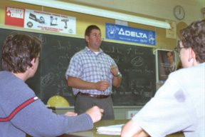 workbench. Gélinas stands at the board. He writes: "Joist spacing
