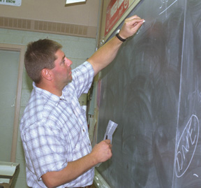 the staff room and by 8:10, he is at his classroom door. A hand-made
