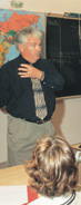 He walks up and down the aisles, stops, darts towards a map at the back of