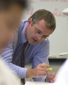 He moves around the class, never still or silent, questioning students in